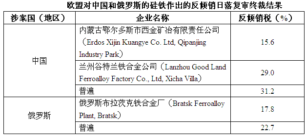 2014年4月10日,歐盟對原產(chǎn)于中國和俄羅斯的硅鐵作出反傾銷日落復審終裁:如果取消對原產(chǎn)于中國和俄羅斯硅鐵的反傾銷措施將會削弱成員國內(nèi)企業(yè)在歐盟市場的核心地位,且會因為中國和俄羅斯硅鐵的傾銷價格而對成員國內(nèi)企業(yè)繼續(xù)造成損害,因此決定繼續(xù)對中國和俄羅斯硅鐵采取反傾銷措施。