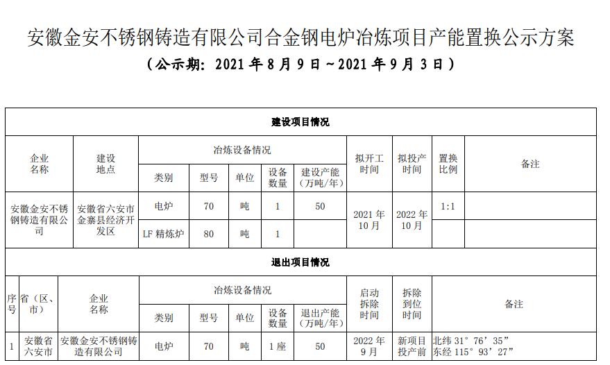 按照《國(guó)務(wù)院關(guān)于化解產(chǎn)能嚴(yán)重過剩矛盾的指導(dǎo)意見》《國(guó)務(wù)院關(guān)于鋼鐵行業(yè)化解過剩產(chǎn)能實(shí)現(xiàn)脫困發(fā)展的意見》和《鋼鐵行業(yè)產(chǎn)能置換實(shí)施辦法》要求,現(xiàn)將安徽金安不銹鋼鑄造有限公司合金鋼電爐冶煉項(xiàng)目產(chǎn)能置換方案予以公示,歡迎社會(huì)公眾進(jìn)行監(jiān)督。