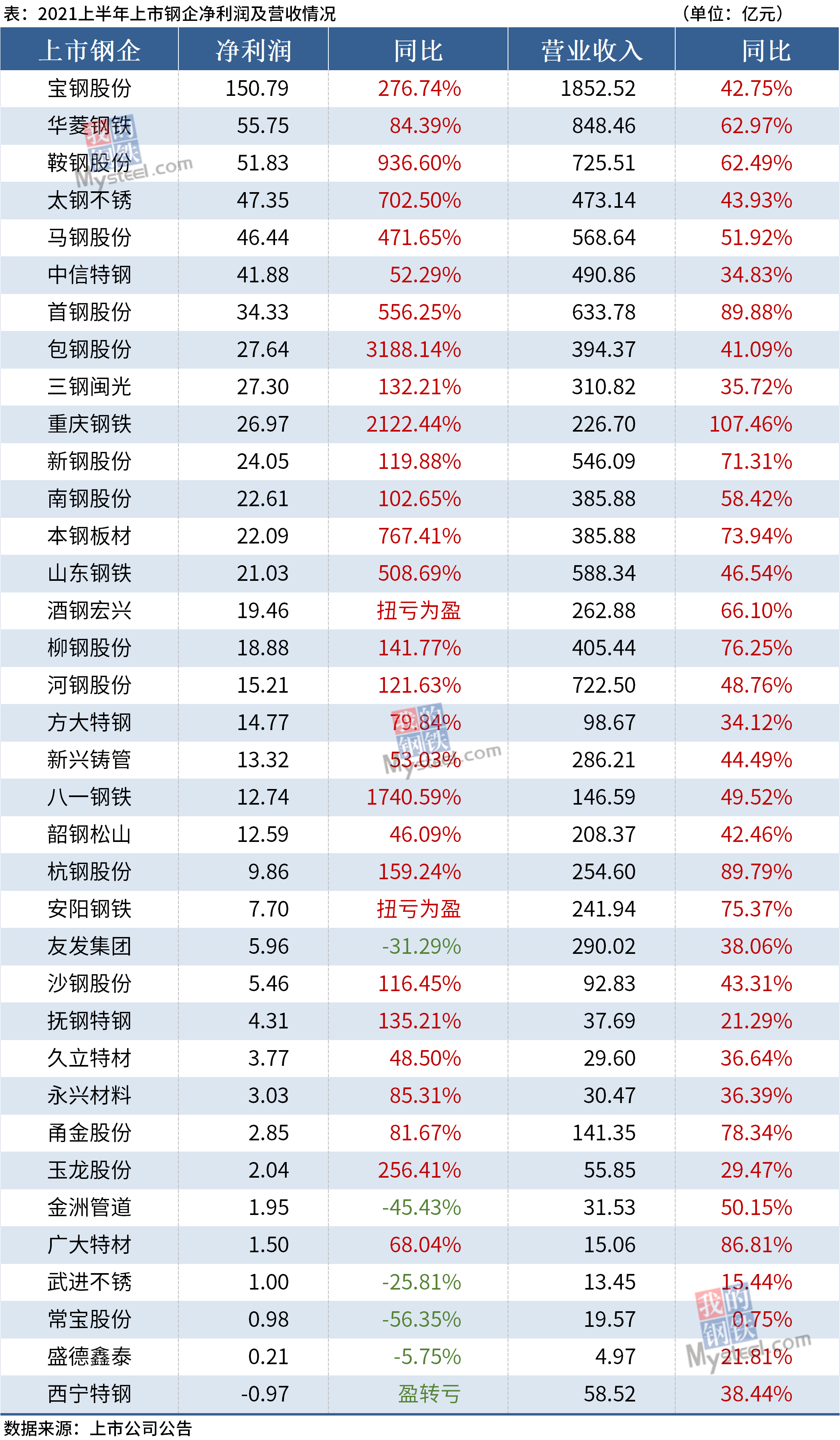 截至8月27日,36家上市鋼企2021年半年報出爐,35家企業(yè)實現(xiàn)盈利。其中,寶鋼股份實現(xiàn)凈利150.79億元排第一,華菱鋼鐵和鞍鋼股份分別以55.75億元和51.83億元排第二和第三。