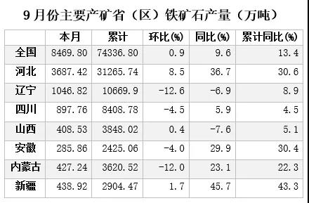 9月份,新疆鐵礦石原礦產(chǎn)量為438.92萬噸,環(huán)比增加7.47萬噸,增長1.7%,同比大幅增長45.7%;當(dāng)月產(chǎn)量占全國總產(chǎn)量的5.2%,較上年同期占比增加1.1個(gè)百分點(diǎn)。1-9月份累計(jì)產(chǎn)量為2904.47萬噸,同比大幅增長43.3%。