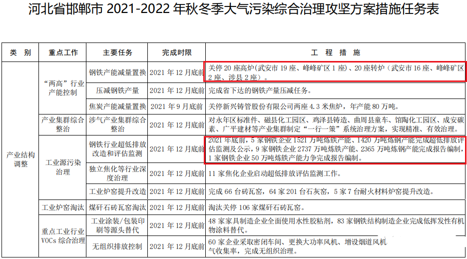 2021年10月28日,《河北省邯鄲市2021-2022年秋冬季大氣污染綜合治理攻堅方案措施任務表》發(fā)布,2021年12月底前,關停 20 座高爐(武安市 19 座、峰峰礦區(qū) 1 座)、20 座轉爐(武安市 16 座、峰峰礦區(qū) 2 座、涉縣 2 座)。