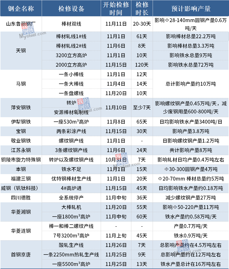 據(jù)Mysteel不完全統(tǒng)計(jì),11月全國(guó)有28家鋼廠發(fā)布檢修計(jì)劃,其中,山西有10家樣本鋼廠檢修;浙江有2家鋼廠在檢修,其他地區(qū)在檢修鋼廠16家。