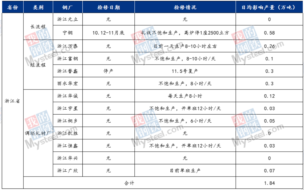 據(jù)Mysteel調(diào)研,截至11月5日,浙江省內(nèi)鋼廠仍處于不飽和生產(chǎn)狀態(tài),長(zhǎng)流程鋼廠寧鋼檢修至11月底,日均影響產(chǎn)量0.58萬(wàn)噸。短流程鋼廠浙江萬(wàn)泰、浙江富鋼、麗水華宏均不飽和生產(chǎn),日均影響產(chǎn)量0.66萬(wàn)噸。