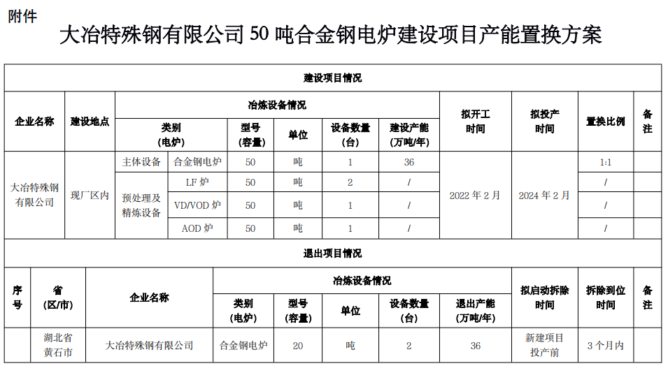 附件:大冶特殊鋼有限公司50噸合金鋼電爐建設(shè)項(xiàng)目產(chǎn)能置換方案