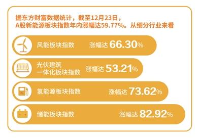 據(jù)東方財富數(shù)據(jù)統(tǒng)計,截至12月24日,A股新能源板塊指數(shù)年內(nèi)漲幅達(dá)54.27%,從細(xì)分行業(yè)來看,風(fēng)能板塊指數(shù)漲幅達(dá)62.66%,光伏建筑一體化板塊指數(shù)年內(nèi)漲幅達(dá)47.74%,氫能源板塊指數(shù)年內(nèi)漲幅達(dá)68.06%,儲能板塊指數(shù)漲幅達(dá)77.02%。