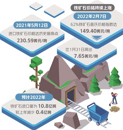 中國鐵礦石價(jià)格指數(shù)監(jiān)測顯示,62%鐵礦石直進(jìn)月均價(jià)已從2021年11月94.57美元/噸,升至2022年2月均價(jià)148.27美元/噸,2022年2月10日單日價(jià)格達(dá)到152.46美元/噸。