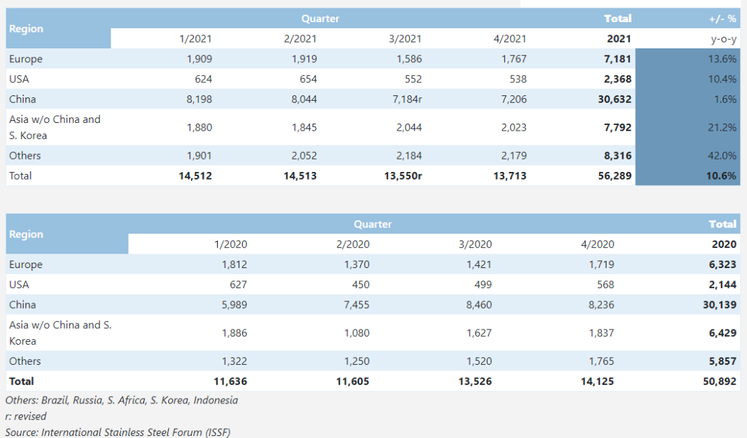 3月14日,國(guó)際不銹鋼論壇(ISSF)發(fā)布統(tǒng)計(jì)數(shù)據(jù)顯示,2021年,全球不銹鋼粗鋼產(chǎn)量達(dá)5628.9萬(wàn)噸,較上年的5089.2萬(wàn)噸增長(zhǎng)約10.6%。其中中國(guó)大陸由2020年得3013.9萬(wàn)噸至2021年3063.2萬(wàn)噸,同比增長(zhǎng)1.6%。