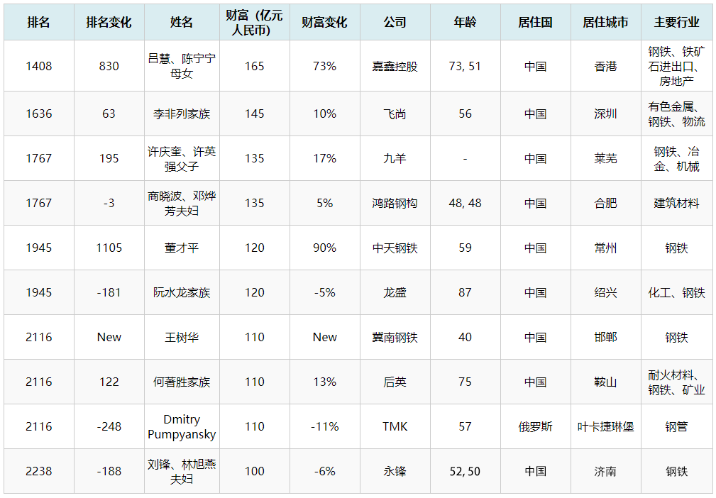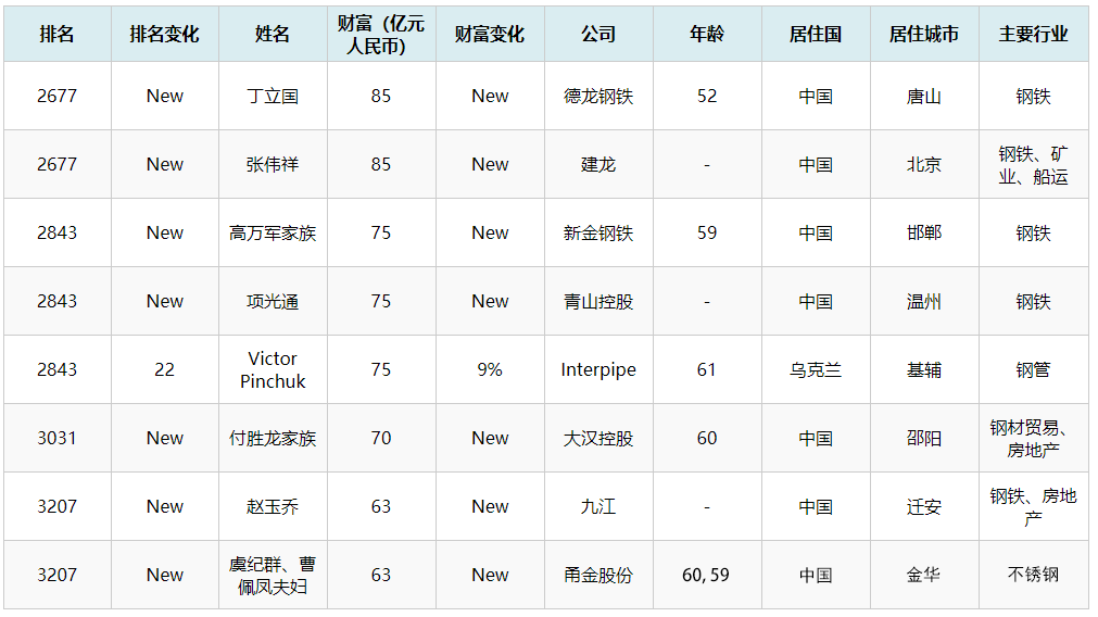 國內(nèi)鋼鐵行業(yè),杜雙華(560億)、方威(465億)、孫壽寬(450億)、沈文榮、張志祥、項光達(dá)、高興江、李趕坡、張榮華、董才平、王樹華、劉鋒、丁立國等多位企業(yè)家上榜。