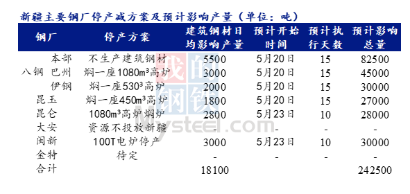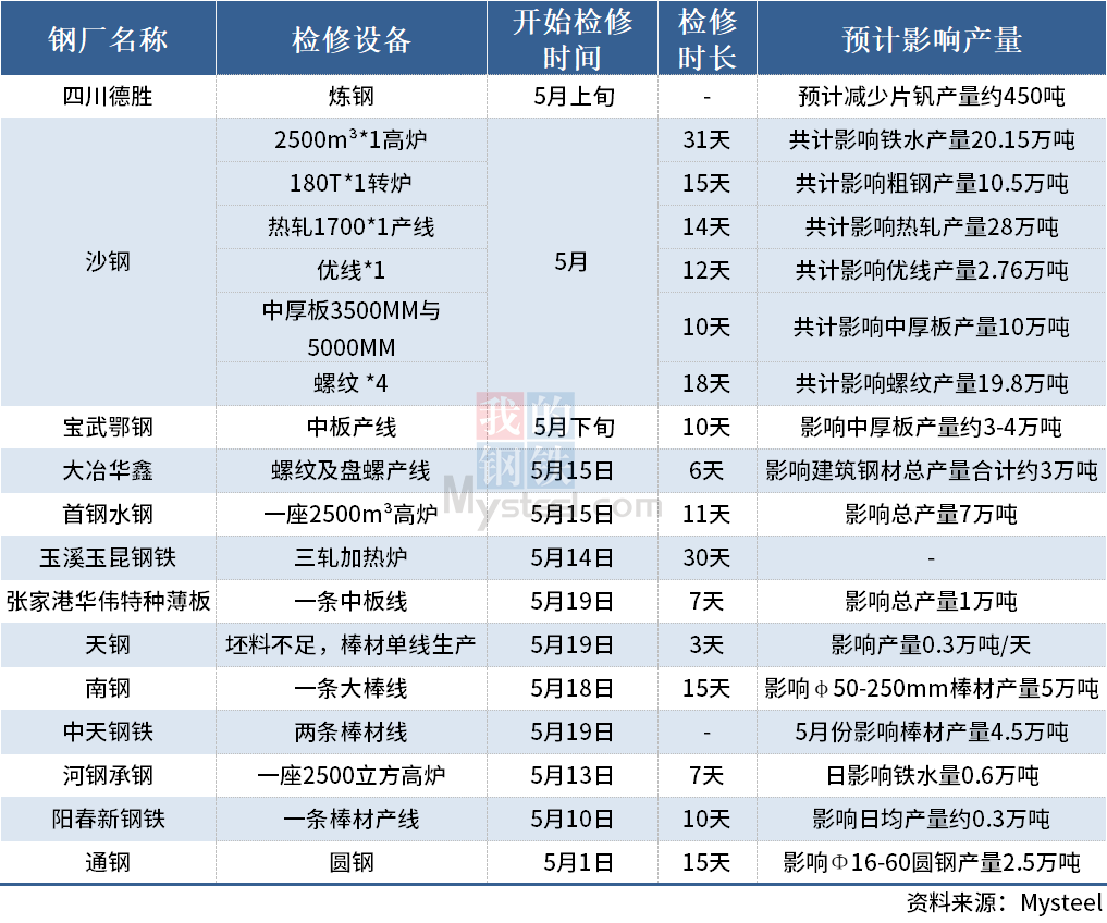 據(jù)Mysteel不完全統(tǒng)計,截至5月20日,國內(nèi)13家鋼廠發(fā)布檢修計劃。其中,中天鋼鐵因一座轉(zhuǎn)爐檢修,坯料不足,兩條棒材線停產(chǎn)檢修,預計5月份影響棒材產(chǎn)量4.5萬噸;南鋼于5月18日起對一條大棒線進行檢修,為期半個月,預計影響φ50-250mm棒材產(chǎn)量5萬噸。