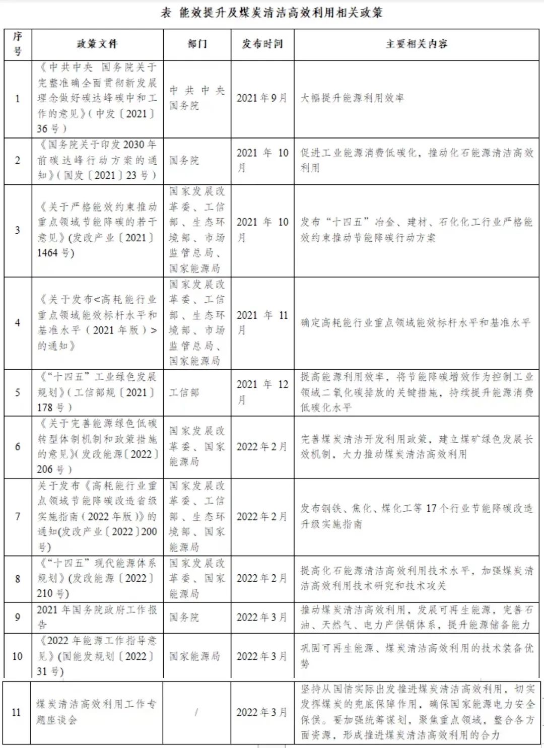 “富煤貧油少氣”的能源資源稟賦特點決定了我國必須長期堅持煤炭清潔高效利用道路。國家高度重視煤炭清潔高效利用,多項政策文件均提出要加強提升能效水平(見表)。