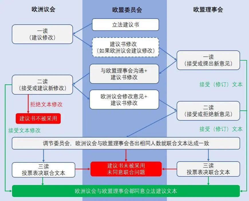 歐洲議會(huì)通過(guò)“碳關(guān)稅”立法后,將向歐盟理事會(huì)提交修正草案,由歐盟理事會(huì)對(duì)修改草案進(jìn)行“一讀”,如果歐盟立法機(jī)構(gòu)的各方不能達(dá)成一致意見(jiàn),可能還需進(jìn)行“二讀”甚至“三讀”,距完成真正立法仍有一定距離,歐盟“碳關(guān)稅”法案最終版本在具體細(xì)則上還可能發(fā)生改變。歐盟碳關(guān)稅立法歷程和程序如圖1和圖2所示。