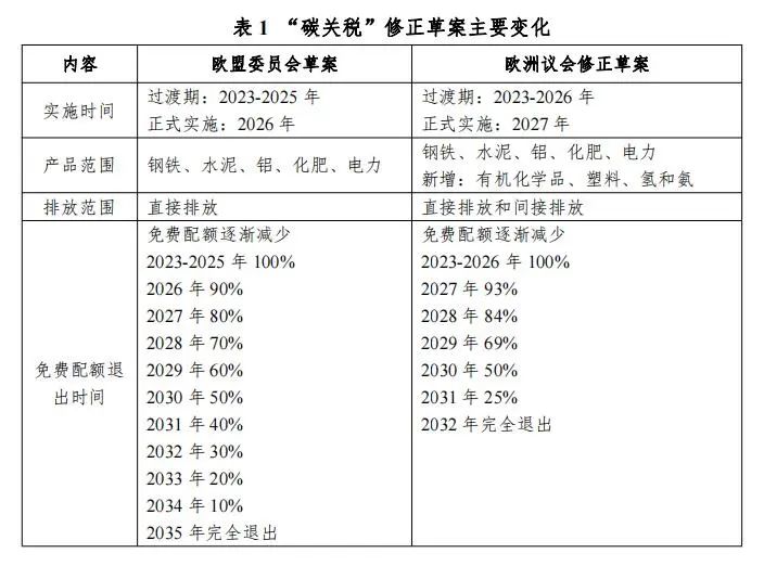 當(dāng)?shù)貢r(shí)間6月22日,歐洲議會(huì)多數(shù)票通過(guò)碳邊境調(diào)節(jié)機(jī)制(又稱(chēng)“碳關(guān)稅”,簡(jiǎn)稱(chēng)CBAM)的“一讀”文本,對(duì)歐盟委員會(huì)“2021年7月公布減碳55%提案提出了正式修正意見(jiàn)”。與歐盟委員會(huì)一年前的“立法草案”相比,歐洲議會(huì)本次通過(guò)的修正草案擴(kuò)大了納入行業(yè)范圍、增加間接排放、加快免費(fèi)配額退出時(shí)間,延長(zhǎng)了過(guò)渡期,主要變化如表1所示。