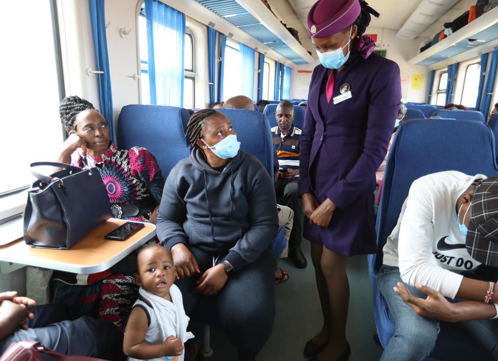 7月29日,列車(chē)員菲奧娜(站立者)在蒙內(nèi)鐵路客運(yùn)列車(chē)上與乘客交流。新華社記者董江輝攝