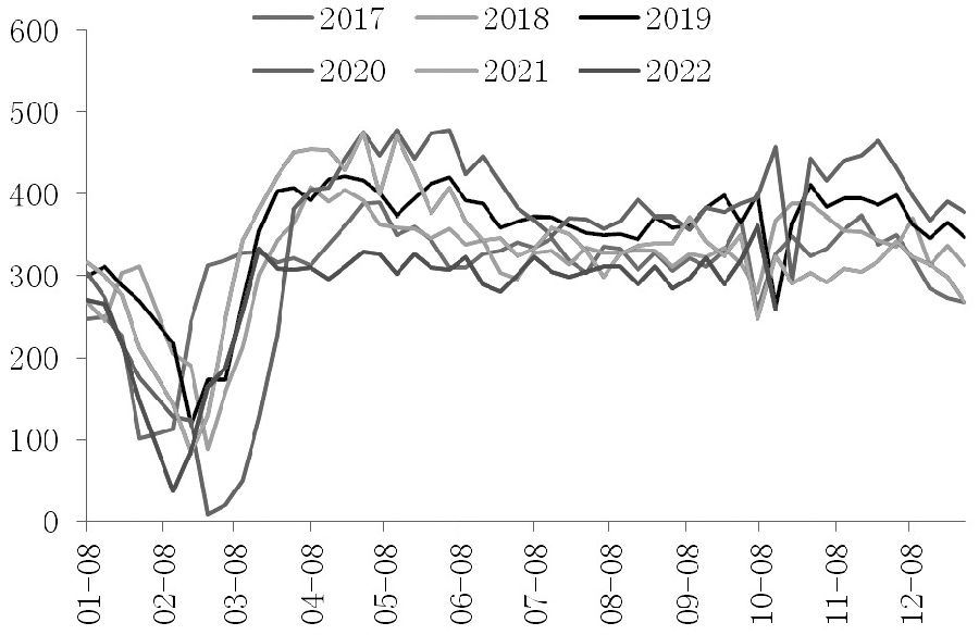受鋼廠利潤(rùn)階段性改善影響,8—9月鋼材供應(yīng)呈現(xiàn)階段性回升,高爐日均鐵水產(chǎn)量從7月底的213.58萬(wàn)噸回升至240.22萬(wàn)噸。但10月份之后鋼廠復(fù)產(chǎn)邏輯可能有所變化:一是,在低需求之下,鋼材供應(yīng)的回升導(dǎo)致原料價(jià)格漲幅明顯強(qiáng)于成材,鋼廠利潤(rùn)明顯收窄。最新的長(zhǎng)流程螺紋鋼利潤(rùn)在250元/噸附近,短流程谷電利潤(rùn)在15元/噸附近,相較8月初均有明顯收窄。二是,10月中旬之后北方采暖季來(lái)臨,階段性限產(chǎn)力度可能有所增加。據(jù)統(tǒng)計(jì),截至10月9日,全國(guó)已經(jīng)有13個(gè)省份陸續(xù)出臺(tái)了2022年大氣污染百日攻堅(jiān)行動(dòng)方案;唐山地區(qū)部分鋼企也于10月9日接到了燒結(jié)自10月14日起限產(chǎn)50%的通知。所以,當(dāng)前鋼材供應(yīng)可能已經(jīng)接近頂部區(qū)域,后期繼續(xù)增長(zhǎng)空間有限。10月第一周,高爐日均鐵水產(chǎn)量環(huán)比下降0.28萬(wàn)噸,至239.94萬(wàn)噸,螺紋鋼周度產(chǎn)量也已經(jīng)連續(xù)兩周環(huán)比回落。