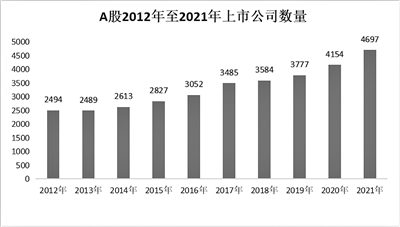 A股2012年至2021年上市公司數(shù)量 數(shù)據(jù)來源:Wind