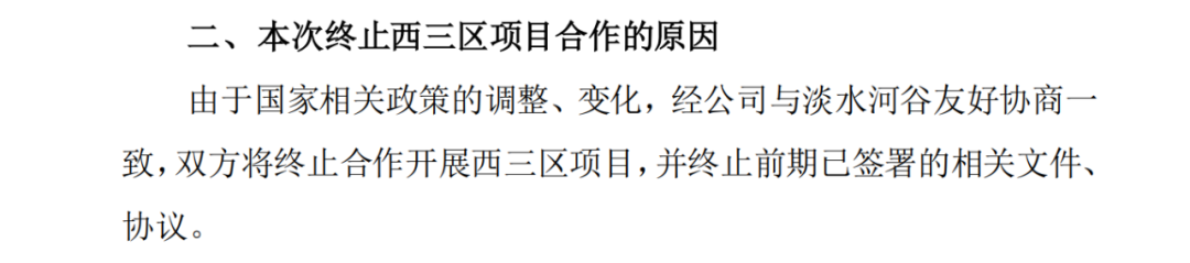 公告稱,此次終止西三區(qū)項目合作的原因,是由于國家相關政策的調(diào)整、變化。
