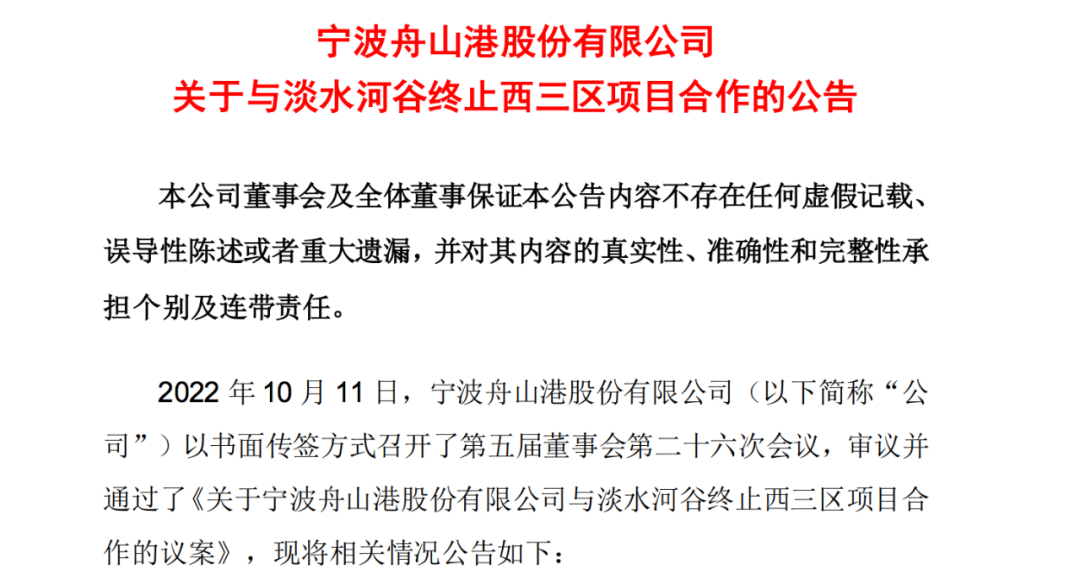 10月12日,寧波舟山港股份有限公司(簡稱寧波舟山港),發(fā)布關于與國際公司(淡水河谷的全資子公司,簡稱淡水河谷)終止浙江舟山鼠浪湖西三區(qū)項目(簡稱西三區(qū)項目)合作的公告。