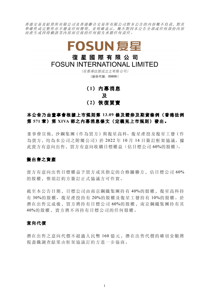 10月19日,復(fù)星國(guó)際正式官宣出售南鋼股權(quán)。
