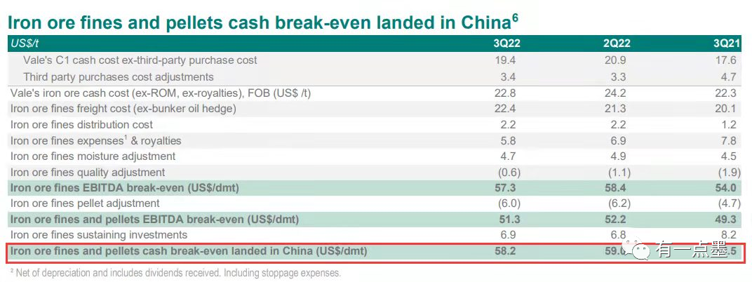 再來看一下還能跌倒什么位置。這個問題很直接,價格下沿就是看礦山成本問題,我們暫時先不用管國產(chǎn)礦山的成本,單來看海外礦山成本,極端一點(diǎn)考慮四大礦山的成本,我們來看一下到中國成本最高的Vale,Vale公布的三季度財報數(shù)據(jù)顯示,其鐵礦石落地中國的現(xiàn)金收支平衡點(diǎn)在58.2美元,這樣就相當(dāng)直觀了。