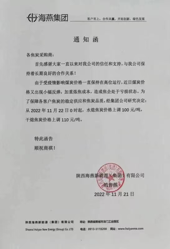 期貨日報記者發(fā)現(xiàn),11月初焦炭價格全面下跌,截至11月10日,共下調(diào)三輪。就在21日,多家焦化企業(yè)發(fā)布漲價函。