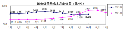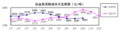 冶金焦10月份加權(quán)平均折算成干基的采購成本2657.32元/噸,環(huán)比升高60.48元/噸,升幅為2.33%。1-10月累計(jì)平均折算成干基的采購成本為2995.55元/噸,同比升高210.10元/噸,升幅為7.54%。