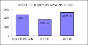 對(duì)標(biāo)企業(yè)煉焦煤10月份加權(quán)平均折算成干基的采購成本為2225.52元/噸,環(huán)比升高70.70元/噸,升幅為3.28%。1-10月累計(jì)平均折算成干基的采購成本為2395.15元/噸,同比升高660.58元/噸,升幅為38.08%。