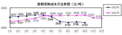 廢鋼10月份加權(quán)平均采購成本為2722.85元/噸,環(huán)比下降65.32元/噸,降幅為2.34%。1-10月累計(jì)平均采購成本為3177.06元/噸,同比下降75.75元/噸,降幅為2.33%。