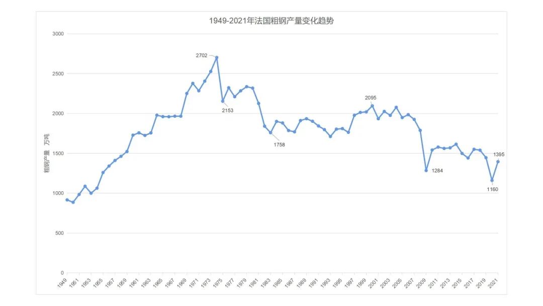 圖5 1949-2021年法國粗鋼產(chǎn)量變化趨勢