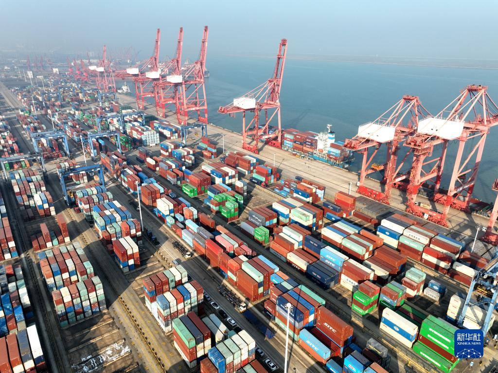 12月7日拍攝的唐山港京唐港區(qū)集裝箱碼頭一角(無人機(jī)照片)。新華社發(fā)(李磊 攝)