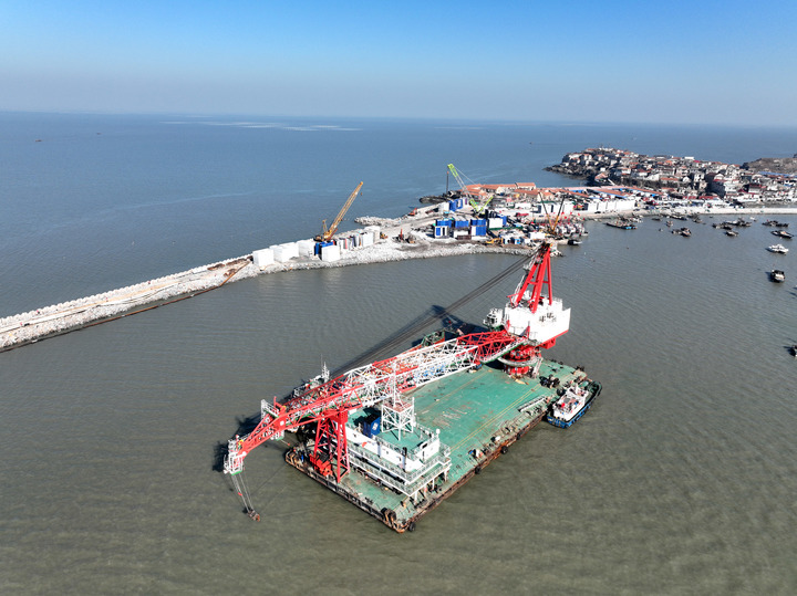 1月29日,在江蘇省連云港市連島國家級中心漁港,大型浮吊在海上作業(yè)(無人機(jī)照片)。新華社發(fā)(王春攝)