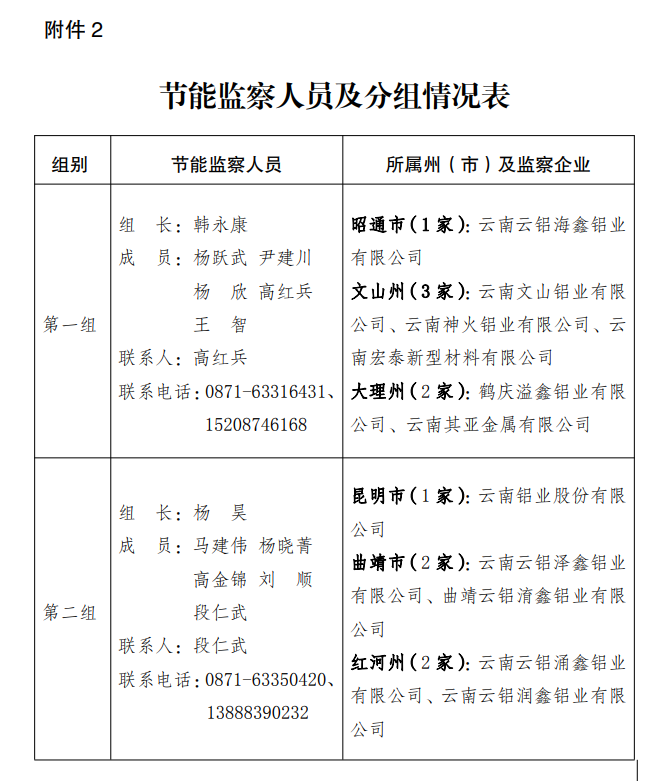 (一)請相關(guān)州(市)發(fā)展改革委派專人配合開展本地區(qū)電解鋁企業(yè)的現(xiàn)場節(jié)能監(jiān)察,并通知企業(yè)做好相關(guān)準(zhǔn)備工作。節(jié)能監(jiān)察人員及分組情況詳見附件2。