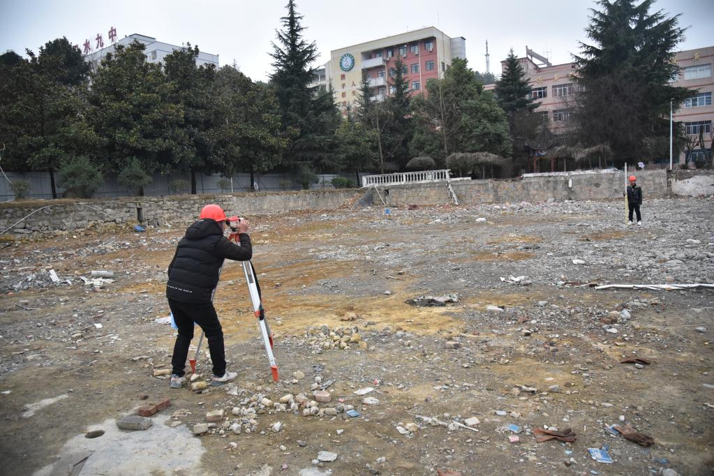 走進位于貴州省遵義市習(xí)水縣老城區(qū)的習(xí)水縣第九中學(xué),施工場地上,工作人員正在勘測。眼前拆除的是學(xué)校一棟“服役”超過30年的3層教學(xué)樓。