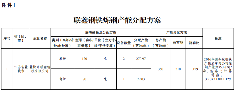 附件:1.聯(lián)鑫鋼鐵煉鋼產(chǎn)能分配方案