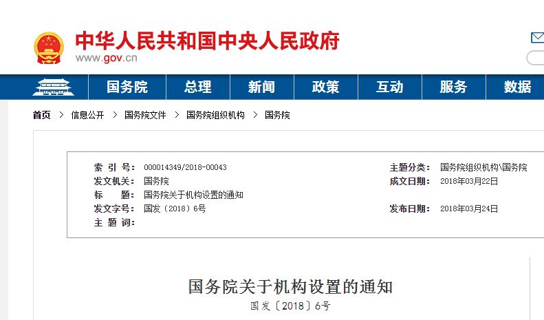 根據(jù)黨的十九屆三中全會審議通過的《深化黨和國家機構(gòu)改革方案》、第十三屆全國人民代表大會第一次會議審議批準的國務(wù)院機構(gòu)改革方案和國務(wù)院第一次常務(wù)會議審議通過的國務(wù)院直屬特設(shè)機構(gòu)、直屬機構(gòu)、辦事機構(gòu)、直屬事業(yè)單位設(shè)置方案,現(xiàn)將國務(wù)院機構(gòu)設(shè)置通知如下: