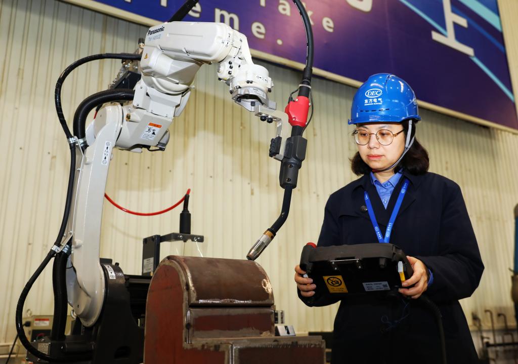全國人大代表曹天蘭正在進(jìn)行焊接機(jī)器人模擬試驗(yàn)。賈偉明攝