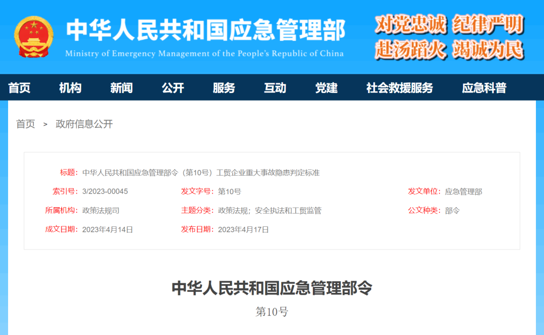 《工貿(mào)企業(yè)重大事故隱患判定標(biāo)準(zhǔn)》已經(jīng)2023年3月20日應(yīng)急管理部第7次部務(wù)會(huì)議審議通過,現(xiàn)予公布,自2023年5月15日起施行。