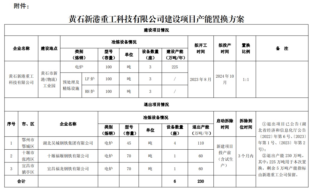 按照《國務(wù)院關(guān)于化解產(chǎn)能嚴(yán)重過剩矛盾的指導(dǎo)意見》《國務(wù)院關(guān)于鋼鐵行業(yè)化解過剩產(chǎn)能實(shí)現(xiàn)脫困發(fā)展的意見》和《鋼鐵行業(yè)產(chǎn)能置換實(shí)施辦法》要求,黃石新港重工科技有限公司建設(shè)3座100噸電爐冶煉項(xiàng)目產(chǎn)能置換方案公示期間社會(huì)公眾無異議,現(xiàn)予以公告。