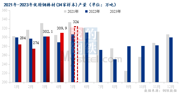 4月全國優(yōu)特鋼棒材(34家樣本)產量309.9萬噸,環(huán)比增加7.8萬噸,同比增加20.7萬噸;5月預計產量324萬噸,環(huán)比增加14.1萬噸,同比增加17.17萬噸;