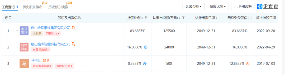 另據(jù)企查查顯示,2022年9月28日,唐山金馬鋼鐵集團(tuán)有限公司出資2.5億元,成為赤峰中唐特鋼有限公司新增股東。