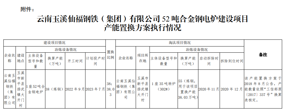 附件:云南玉溪仙福鋼鐵(集團)有限公司52噸合金鋼電爐建設(shè)項目產(chǎn)能置換方案執(zhí)行情況