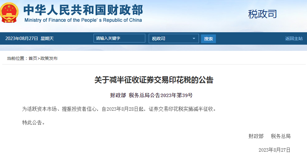 8月27日,財(cái)政部、國(guó)家稅務(wù)總局聯(lián)合發(fā)布公告,為活躍資本市場(chǎng)、提振投資者信心,自2023年8月28日起,證券交易印花稅實(shí)施減半征收。
