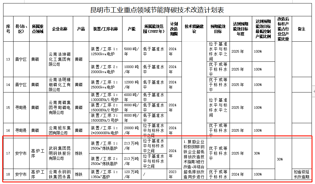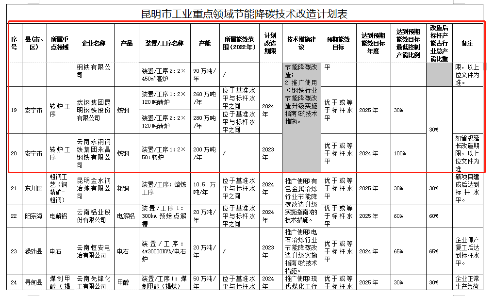 各企業(yè)要積極推動存量項(xiàng)目開展節(jié)能降碳技術(shù)改造,推廣使用先進(jìn)技術(shù)裝備。各縣(市)、區(qū)人民政府,滇中新區(qū)管委會,各開發(fā)(度假)區(qū)、自貿(mào)試驗(yàn)(經(jīng)濟(jì)合作)區(qū)管委會要督促各企業(yè)在本方案印發(fā)后一個月內(nèi)根據(jù)改造計(jì)劃表(附件1)制定周密細(xì)致的具體工作方案,明確落實(shí)措施,原則上改造計(jì)劃不超過2024年(2023年版新增11個重點(diǎn)領(lǐng)域?yàn)?025年),改造完成后一年能效水平達(dá)到預(yù)期目標(biāo)。各企業(yè)具體工作方案需報(bào)屬地縣級人民政府、管委會審核后報(bào)市發(fā)展改革委、市工業(yè)和信息化局、市生態(tài)環(huán)境局、市市場監(jiān)管局備案。