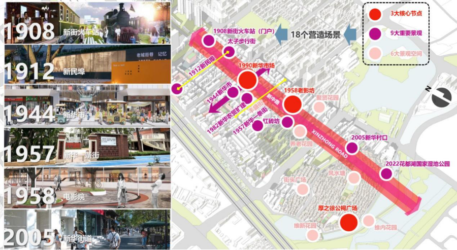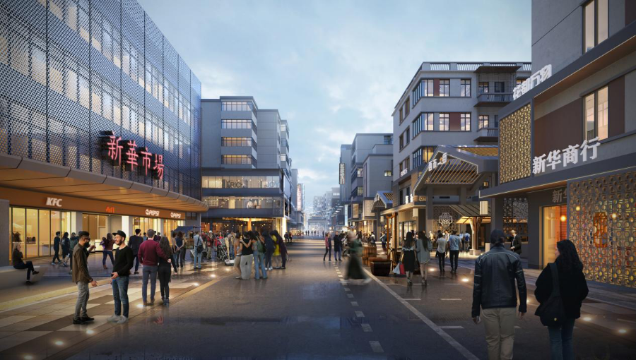 項目提出,打造新中路老城記憶軸線,南北向串聯(lián),老區(qū)舊芯縫合。依托“新中路”軸線及商業(yè)大道發(fā)展軸線打造提升的契機,推進沿街立面改造,促進片區(qū)整體提升;結(jié)合本地業(yè)態(tài),融合當(dāng)?shù)匚幕?,建設(shè)“新華市場+墟市”雙核心;沿新中路軸線,落實多個節(jié)點的改造,以點連線、以線成面。
