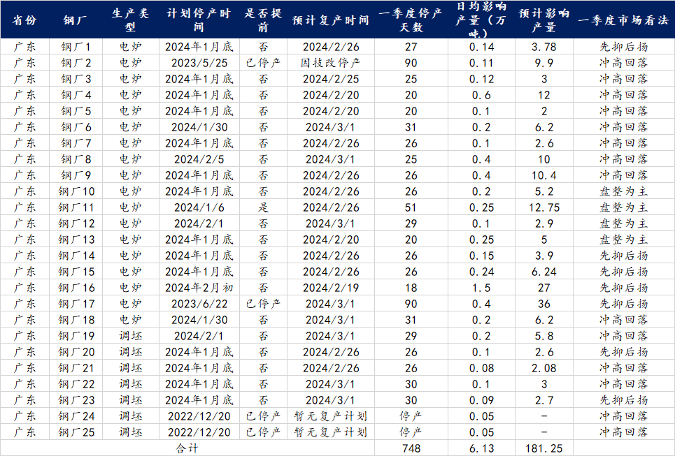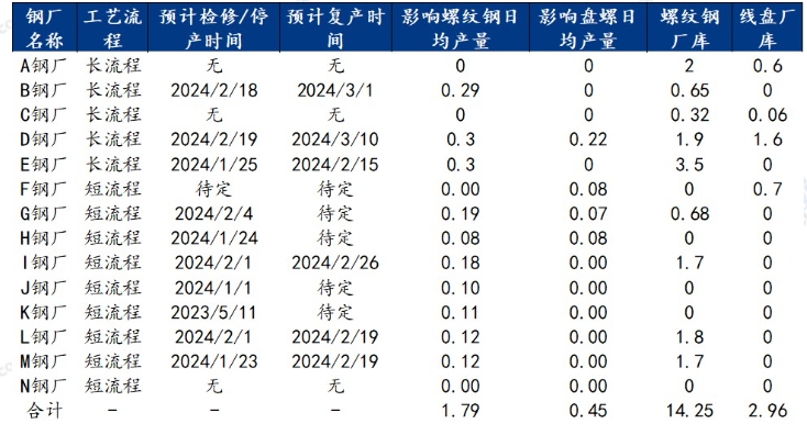 據(jù)Mysteel不完全統(tǒng)計(jì),截至1月31日,國(guó)內(nèi)多家鋼廠發(fā)布停產(chǎn)檢修信息。其中,衢州元立計(jì)劃2月20日開始對(duì)中棒線進(jìn)行檢修,3月3日中棒線結(jié)束后開始對(duì)小棒線進(jìn)行檢修,3月15日結(jié)束。