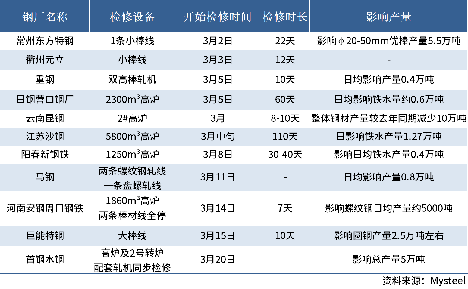 據(jù)Mysteel不完全統(tǒng)計,截至2024年3月15日,國內(nèi)11家鋼廠發(fā)布檢修計劃。其中,巨能特鋼于3月15日起大棒線檢修十天左右,預(yù)計影響Φ100-310mm圓鋼產(chǎn)量2.5萬噸左右。