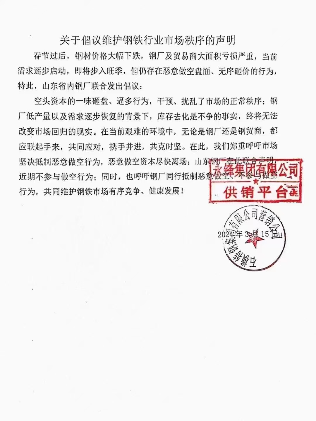 春節(jié)過(guò)后,鋼材價(jià)格大幅下跌,鋼廠及貿(mào)易商大面積虧損嚴(yán)重,當(dāng)前需求逐步啟動(dòng),即將步入旺季,但仍存在惡意做空盤面、無(wú)序砸價(jià)的行為,特此,山東省內(nèi)鋼廠聯(lián)合發(fā)出倡議: