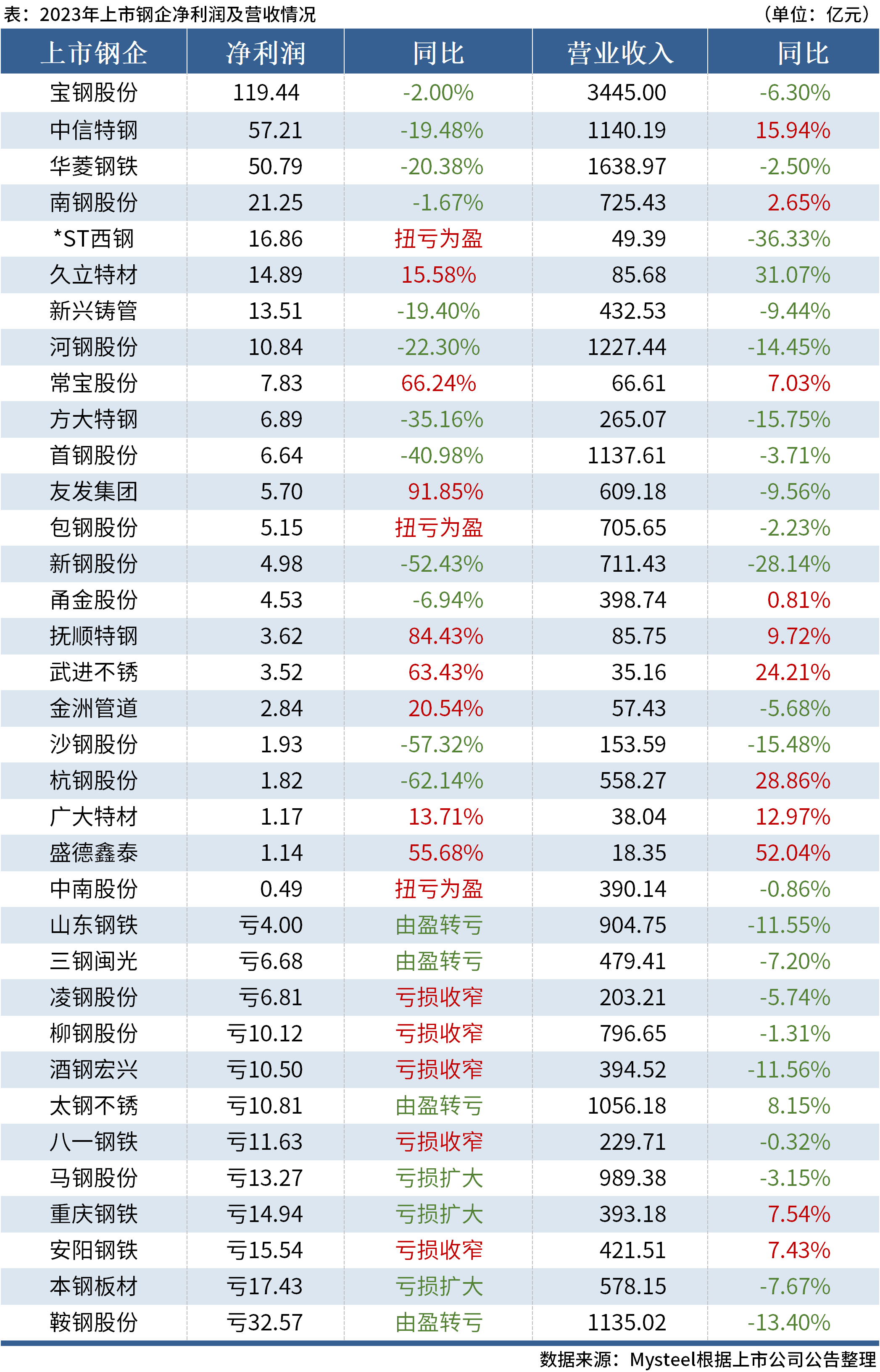據(jù)Mysteel統(tǒng)計,已有35家上市鋼企公布2023年度業(yè)績,合計營業(yè)收入21557.32億元,合計凈利潤208.74億元。