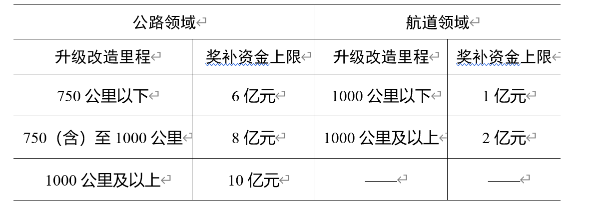 財(cái)政部根據(jù)競爭性評審確定的年度支持名單和交通運(yùn)輸部提出的資金安排建議,結(jié)合財(cái)力情況,按照“獎(jiǎng)補(bǔ)結(jié)合”方式安排資金。其中公路、航道領(lǐng)域獎(jiǎng)補(bǔ)資金分別核定,按照交通運(yùn)輸部核定總投資的一定比例予以獎(jiǎng)補(bǔ),東部、中部、西部地區(qū)獎(jiǎng)補(bǔ)比例分別為40%、50%、60%。實(shí)施第一年按照每個(gè)示范區(qū)域獎(jiǎng)補(bǔ)資金的40%予以補(bǔ)助,用于啟動相關(guān)工作;后續(xù)根據(jù)績效評價(jià)結(jié)果予以獎(jiǎng)勵(lì)。實(shí)施期內(nèi)獎(jiǎng)補(bǔ)資金具體根據(jù)各省份開展的公路、航道數(shù)字化升級改造里程規(guī)模確定,如下表所示。