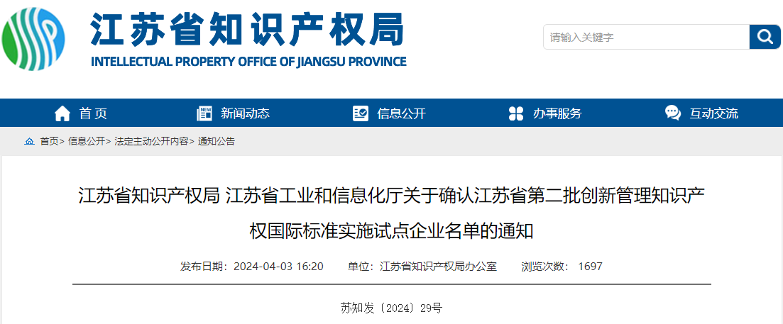 根據(jù)《國家知識產(chǎn)權局辦公室工業(yè)和信息化部辦公廳關于組織開展創(chuàng)新管理知識產(chǎn)權國際標準實施試點的通知》(國知辦發(fā)運字〔2023〕23號)和《江蘇省知識產(chǎn)權局 江蘇省工業(yè)和信息化廳關于印發(fā)江蘇省創(chuàng)新管理知識產(chǎn)權國際標準實施試點工作方案的通知》(蘇知發(fā)〔2023〕41號),經(jīng)各地推薦,省知識產(chǎn)權局會同省工業(yè)和信息化廳確定了我省第二批試點企業(yè)名單,現(xiàn)予以發(fā)布。請各地知識產(chǎn)權和工信部門按照方案要求,加強對試點企業(yè)的政策扶持、業(yè)務指導和跟蹤服務,指導試點企業(yè)完成標準學習、標準執(zhí)行和在線測評等任務,確保試點工作落到實處、取得實效。
