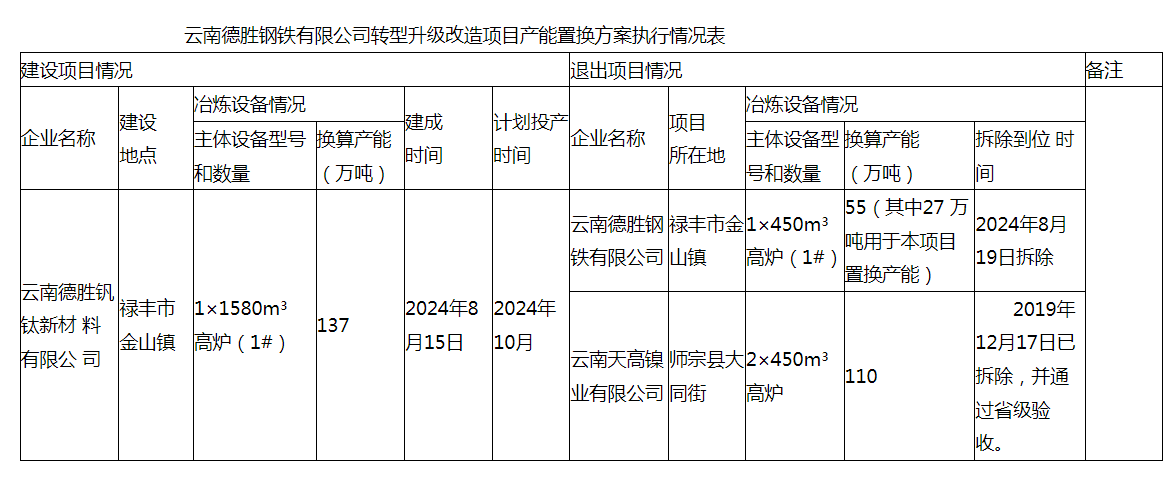 云南德勝鋼鐵有限公司轉(zhuǎn)型升級改造項(xiàng)目產(chǎn)能置換方案執(zhí)行情況公告
